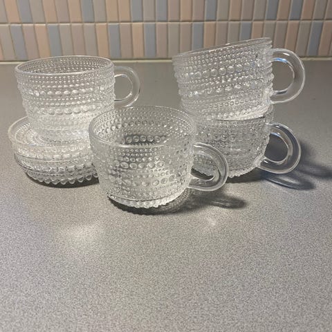 Hakusanat: setti, kahvikupit, nuutajärvi, riihimäen, kirkas, nuutajärven, notsjö, design huonekalut, Paketoitava, Valmistaja, moderni retro, kohokuviointi, aluslautaset, design, lasi, iittala