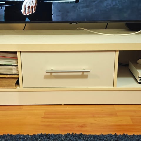 Siisti, tukeva valkoinen TV-taso. Kaksi isoa vetolaatikkoa. Muutama huomaamaton naarmu pinnassa.