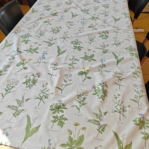 Kaunis kesäinen verho tai pöytäliina norjalaisen Sandvika Veverin mallistosta. Mallin nimi Blåmunke, suunnittelija Unn. Materiaali 100% puuvilla.