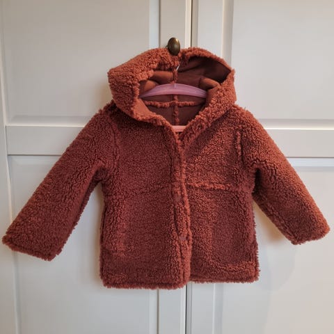 Pompdeluxin ihana harmaa/siniharmaaraidallinen kääntötakki puuvillaa ja polyesteriä. Oli meillä käytössä kesällä viileämpinä päivinä ja alkusyksystä. Koko 86 ja vastaa mielestäni hyvin kokoaan.