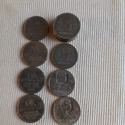 Erittäin hyväkuntoisia 5 mk kolikoita,