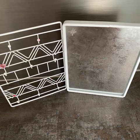 Peili jossa valkoiset kehykset. Itse peilissä pupun kasvot. Takana viimeisen kuvan mukainen mahdollisuus ripustaa seinälle.
