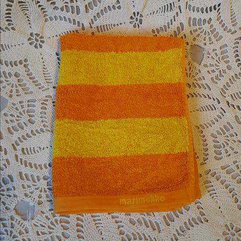 Marimekon jokeri kelta/valkoinen käsipyyhe, pyyhkeen toisella puolella valkealla pohjalla keltainen kuvio, toisella keltaisella pohjalla valkoinen, kerran käytetty ja pesty. pyyhkeitä on 3 kpl, hinta on yhdelle 18 €