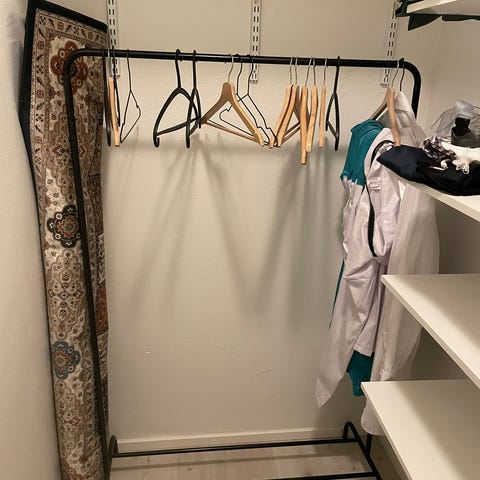 Vaaterekki kahdella kenkähyllyllä. Päissä myös ripustintapit, joihin saa esim. laukkuja roikkumaan.