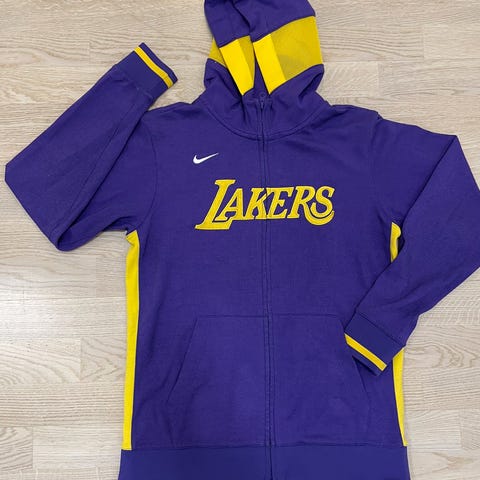 Nike Los Angeles Lakers lasten huppari, koko 170. Huppari on violetti ja suunniteltu koripallon harrastamiseen tai vapaa-aikaan.