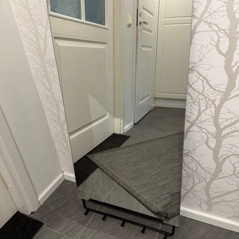 Vaalean ruskeat kehykset ja peilissä kuva kasvoista. Takana viimeisen kuvan mukainen seinälle kiinnitys mahdollisuus.