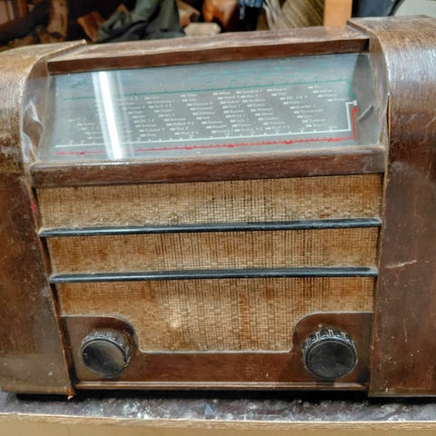 Toimiva putkiradio myynnissä. Naarmuja kuoressa ja joku kukkaruukun jälki sekä messinki koristeet saanut ajan saatossa osumaa.