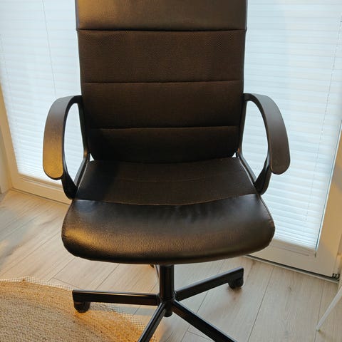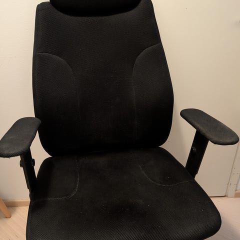Myydään hyväkuntoinen toimistotuoli, mustaa keinonahkaa. Pehmeä selkänoja ja istuintaso. Säädettävä korkeus sivulla olevalla vivulla. Nouto Helsingin Ruoholahdesta tai sovitusti.