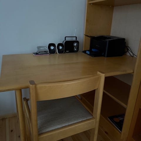 Myydään työpöytä jämälkällä kannella. Koko 120 x 60cm. Jalkojen korkeutta vois säätää. Kannessa pientä käytönjälkeä. En varaile.