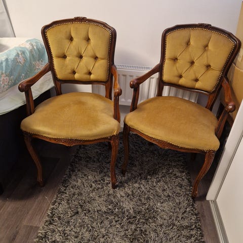 2 mustaa nojatuolia. Materiaali jotain nahkajäljitelmää. Pohjissa levyissä halkeamaa mutta ei vaikuta istumiseen.