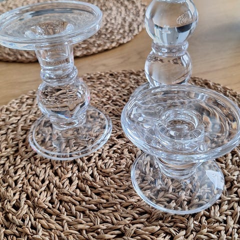 Nuutajärven Kynttilänjalat 2 kpl. Alkuperäinen pakkaus. Leinikki. Design Kerttu Nurminen. kork. 9 cm. halk. 12 cm. Arabia Finland Finn Crystal. Nouto / Postitus kulut lisätään hintaan.