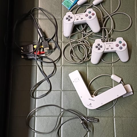 PlayStation 1, 2 ohjainta, multitap, muistikortti ja 3 peliä