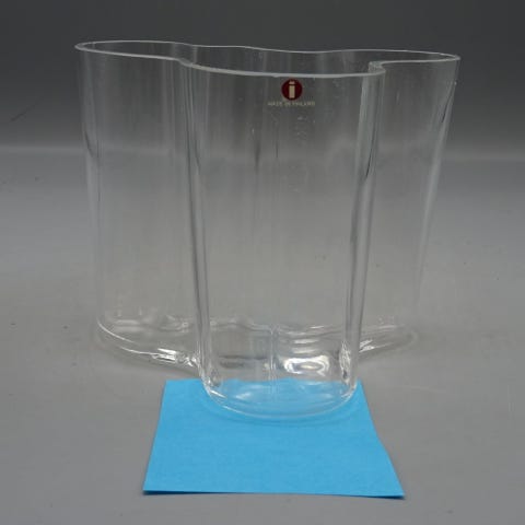 Iso aalto maljakko, korkeus 155 mm, kirkasta lasia. Pohjassa siirtelyjälkiä, muuten ehjä ja siisti. Pohjassa teksti: Alvar Aalto.