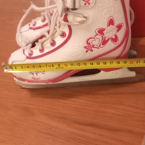 Myydään kuvan mukaiset tyttöjen luistimet. Luistimet ovat ehjät mutta kärjissä käytön jälkiä.