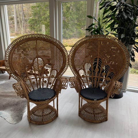 Ihana vaalea rottinkinen riikinkukkotuoli. Koristeena käytetty eli uutta vastaava.