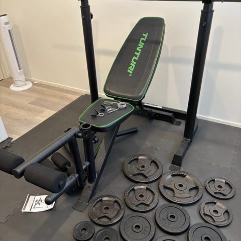 Tunturi painonnostopenkki, jossa on säädettävä selkänoja. Laadukas 20 kg tanko ja parit käsipainot sekä painot mukaan.