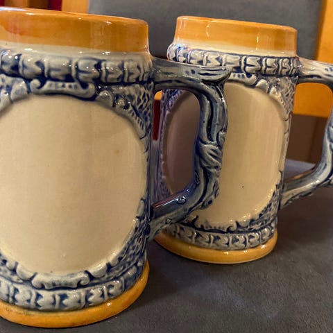 Kaksi vanhaa tuoppia. Toisesta lähtenyt metallilaatta, mutta saa liimattua takaisin. Laatat tummuneet. Laatoissa näkyy himmeällä nimikointi.