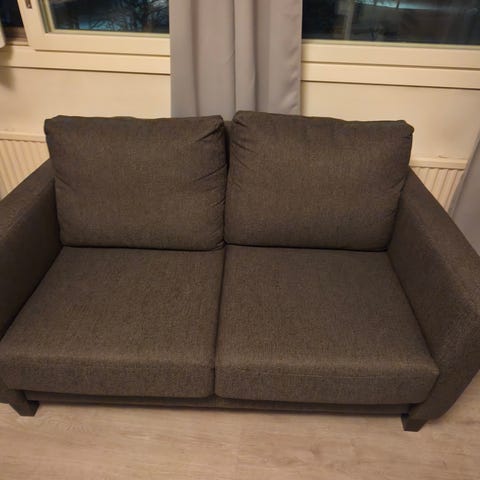 Annetaan elämää nähnyt, mutta kohtuullisen siistissä kunnossa oleva sohva ja rahi. Pesin istuintyynyjen päälliset kesällä, ja en saanut toisen vetoketjua enää kunnolla kiinni (istuimen pehmusteesta on irronnut putua, joka on mennyt ketjun väliin). Tämä ei itseäni haitannut kun vetoketju jää selkänojaa vasten piiloon, mutta kaipa tuon saa korjattuakin jos viitsii askarrella.