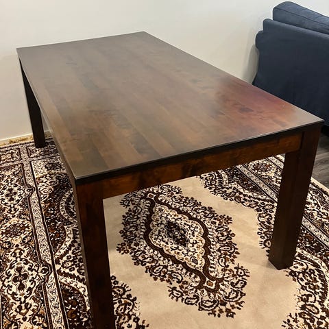 Ruokapöytä 180x90cm. Pöydän pinta on tasainen ja siinä on näkyvissä puun luonnollinen kuviointi.