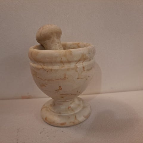Metallinen mortteli ja survin, käytettävä esimerkiksi mausteiden murskaamiseen ja sekoittamiseen keittiössä. Pieni
