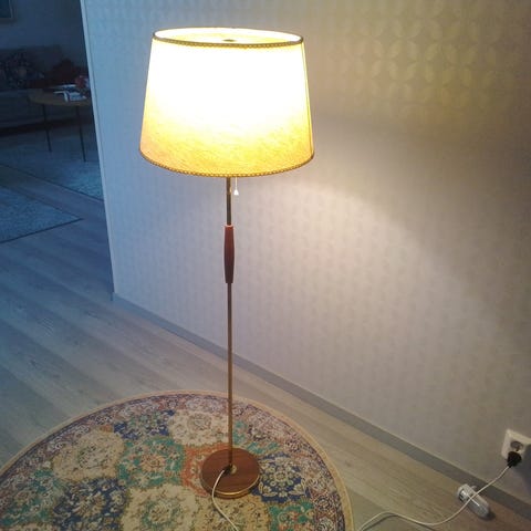 Hyväkuntoinen lattiavalaisin. Valmistaja Sario. Runko puuta, messingin väriset metalliosat.Korkeus 150 cm, varjostimen alaosa 40 cm ja korkeus 40 cm. Paikat kahdelle E27 polttimolle, vedettävä katkaisin. Johdon pistoke "vanhanmallinen".