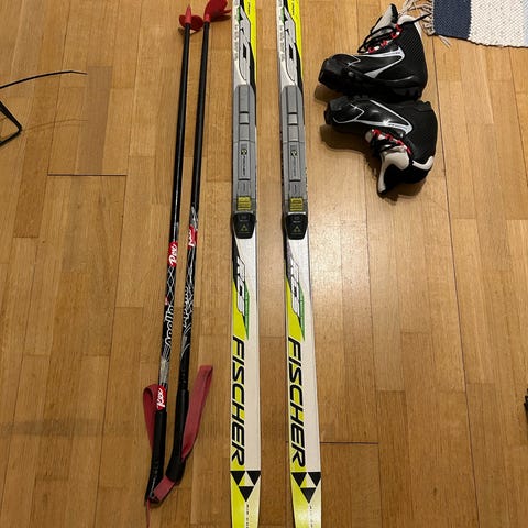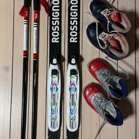 Lasten perinteisen hiihtotyylin suksisetti: Salomon Team Racing sukset, pituus 111 cm SNS profil siteillä, sauvat 85 cm ja yhteensopivat SNS profil Salomon monot koossa 30,5. Pohjallisen pituus 19,5cm.