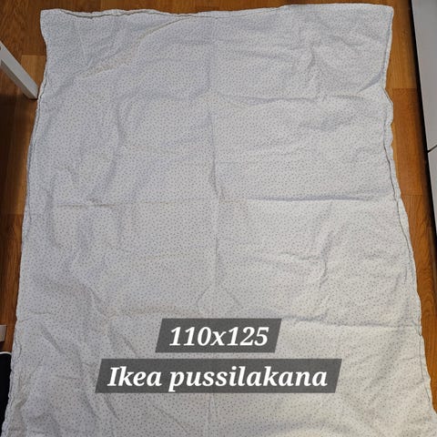 Lasten pussilakanoita 4 kpl ja tyynyliinoja 3 kpl. Pussilakanoiden mitat suunnilleen 100 cm x 115 cm. Tyynyliinat noin 35 cm x 50 cm. Kaikissa hyvä kunto.