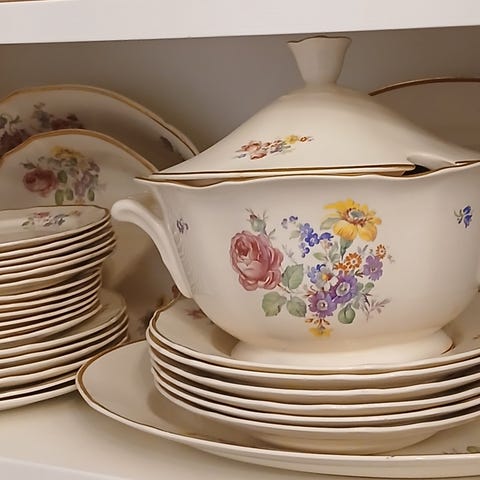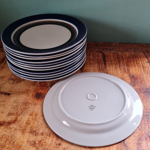 Arabia astiasto, johon kuuluu kannu ja lautasia. Väriltään sinivalkoinen, valmistettu keraamisesta materiaalista. Soveltuu keittiövälineeksi ja tarjoiluun.