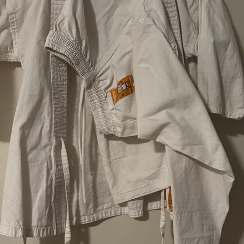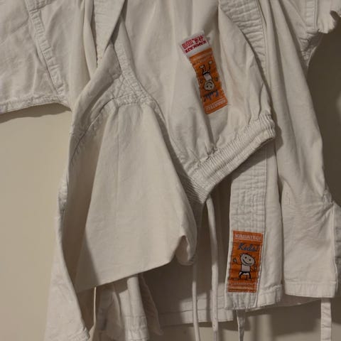 Kamppailulajien puku valkoisena, unisex-koko Muut. Puvussa on pitkähihaiset yläosat ja housut, valmistettu kestävästä materiaalista kamppailulajien harjoitteluun.