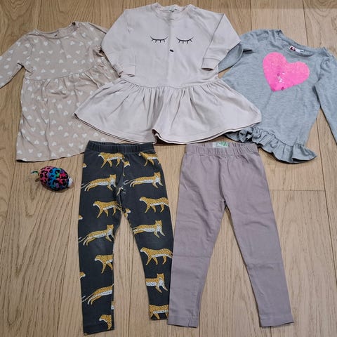 Kiva pieni vaatepaketti kevääksi 98cm tytölle: pehmeitä vaaleanisinisiä farkkuvaatteita mekko, leggingsit ja hame ja 2 pitkähiaista paitaa. Lisäksi Ty pehmolelu. Siistikuntoiset.