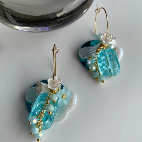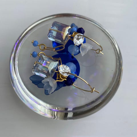 Korvakorut ovat uudet ja käyttämättömät, korvakorurenkaat kullattu teräs, riipus lasi,akryyli, korumetalli, valkoinen/kirkas/kulta.