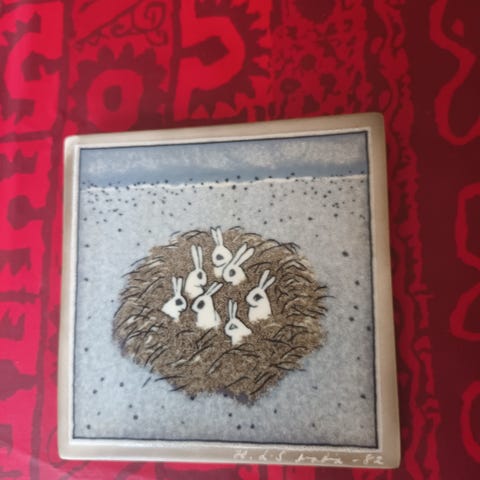 Heljä Liukko-Sundströmin Arabialle vuonna 1982 suunnittelema pieni ”Yhdessä yli sinisen joen” -seinälaatta. Laatta on signeerattu ja takana Arabian leima.