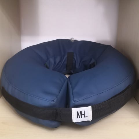 S-M kokoinen sininen puhallettava kauluri koiralle leikkauksen jälkeen. Pannan saa mukaan. Ollut 18kg painavalla bordercolliella. Pannan mitta 38cm. Ollut käytössä 2 vkoa.