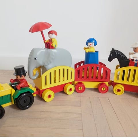Vintage Lego Duplo sirkuskaravaani vuodelta 1988 (2652 Circus Caravan). Sisältää traktorin perävaunuineen, hevosen, koiran ja muutaman hahmon. Moitteettomassa kunnossa.