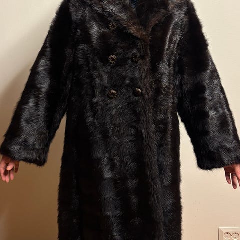 Hyväkuntoinen ja vähän käytetty polven päälle yltävä A-mallinen sisäturkki. Kaniininkarvavuori ja silkkikankainen takin päällinen + samasta materiaalista tehty irroitettava huppu.