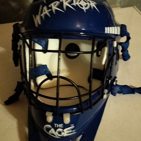 Kulahtanut ja ajan patinoima maski maalivahdille. Koko ei ole selvillä mutta aikuisen päähän tuo ei mahdu, ei ainakaan isopäisen aikuisen. Pehmusteet hiukan repsottaa mutta kaikki osat ovat tallessa. En postita.