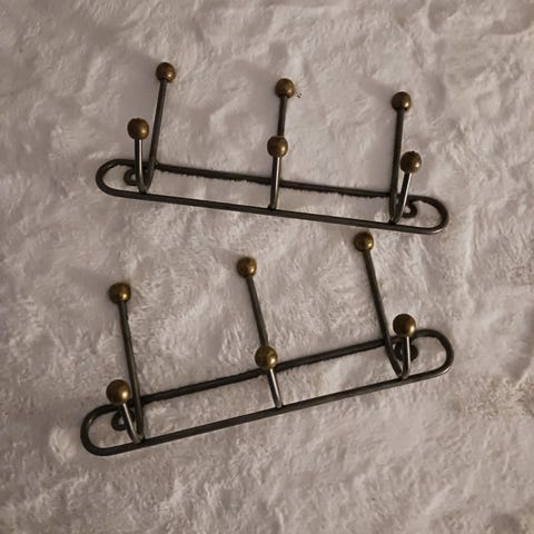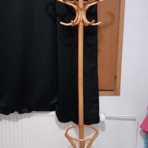Kuvanmukainen naulakko. Kolme hyllyä kengille, kuusi koukkua takeille. Mahdollisuus kiinnittää myös seinään mutta näitä ruuveja ei ole enää tallella. Suht tukeva, kestää hyvin usemman talvitakin painon😄