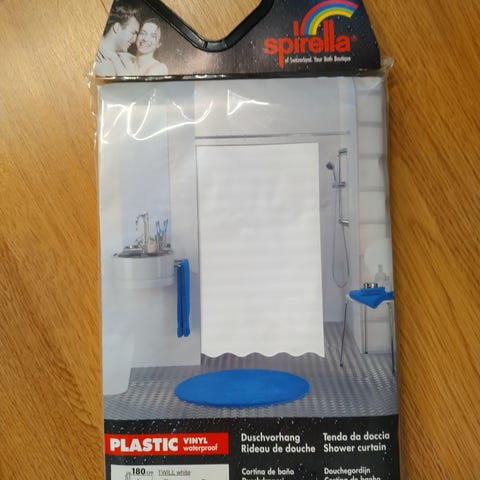 Kylpyhuoneen Finlaysonin suihkuverho, jossa on mustavalkoinen kukkakuosi. Mukaan suihkuverhon kisko ja pidikkeet.