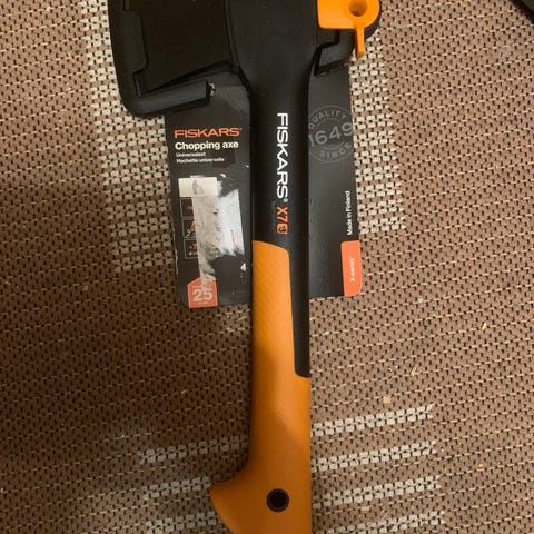 Käyttämätön Fiskars X7 kirves, jossa on oranssi ja musta kahva. Sopii puun pilkkomiseen ja vaikkapa retkeilyyn mukaan mainiosti