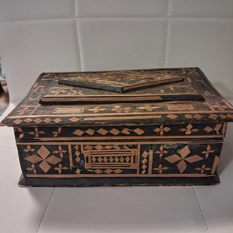 Rasia on 1950- luvulta ajan patinaa, rasia on 17× 12 × 6cm puinen. Esim korurasiana voi käyttää jne.
