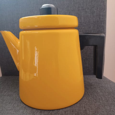 Punainen pehtoorinpannu. Iäkäs. Emalinen. Kulumaa toki löytyy jonkin verran. Korkeus on 13 cm ilman kantta. Halkaisija on 9,5 cm.