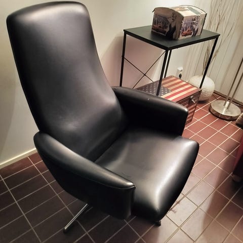Hyvän istumatuntuman omaava nahkainen nojatuoli. Pinnat ovat ehyet, käytön mukanaan tuomaa jälkeä on paikoin. Tuoli on tukevarakenteinen.