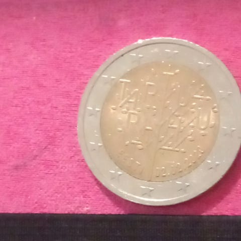 Euro 2 euron kolikko, käytetty. Kolikon halkaisija on noin 25,75 mm ja se on valmistettu kahdesta metallista: kuparin peittämä nikkeli ja kupari-nikkeli seos. Kolikko on yleisesti käytössä euroalueen maissa maksuvälineenä.