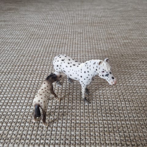 Kaunis valkoinen pilkullinen tamma on nimeltään Diana ja varsa Dexter (Rambon tallissa). Rodultaan nämä ovat Knabstruppeja ( tai Appaloosia)