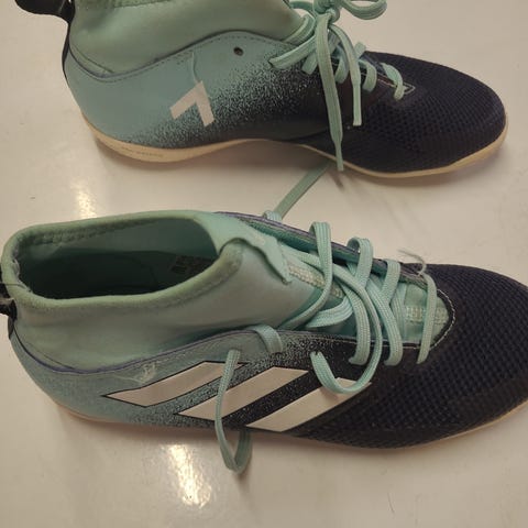 Adidas sisäpelikengät, väri valkoinen ja sininen, koko 38. Kengät on varustettu tarrakiinnityksellä ja kumipohjalla, soveltuvat sisäkäyttöön.
