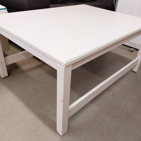 Käteva ja näppärästi liikuteltava pöytä olohuoneeseen. Pöydän molemmilla sivuilla on vetolaatikot, joissa on mukava säilyttää tavaraa katseilta piilossa. Rullat helpottavat liikuttelua. Pinnoilla on siellä täällä pieniä maalivikoja, pöytälevyssä on n. 20cm pitkä naarmu (kuva 3).