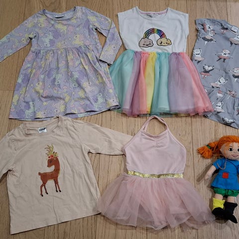 Pakettina siistikuntoiset 98cm vaatteet, osa kaksoiskokoa 98/104cm. Me&I ihana kissamekko, käsityönä tehty Ihana satumetsä mekko, suloinen kirsikka paita, vihreät leggingsit, kultaiset kerhotossut koko 26 ja Peppi Pitkätossu pehmolelu.