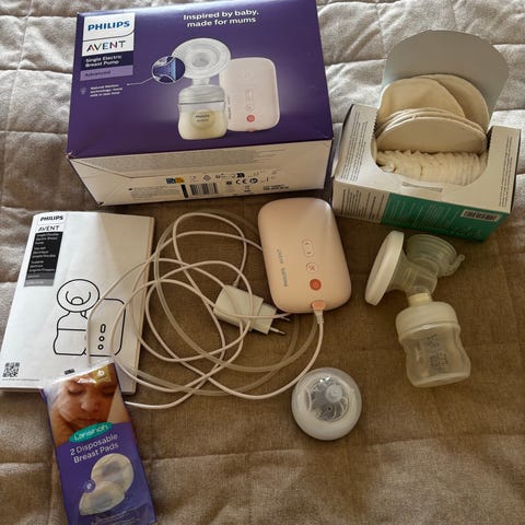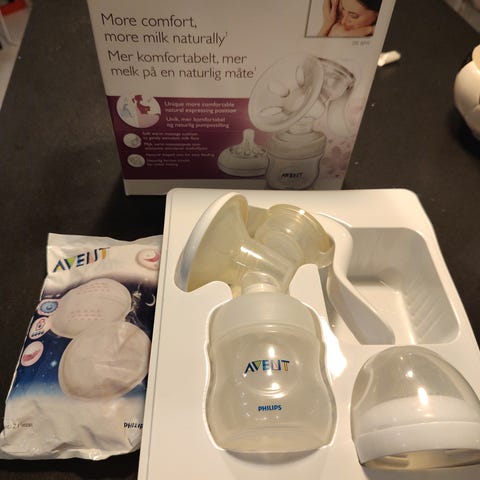 Philips Avent sähkökäyttöinen rintapumppu. Kolme eri voimakkuutta. Toimii verkkovirralla tai paristoilla. Mukana käytetty tuttipullo+vaihtotuttipää (kellastuneet). Käyttöohjeet tallessa.