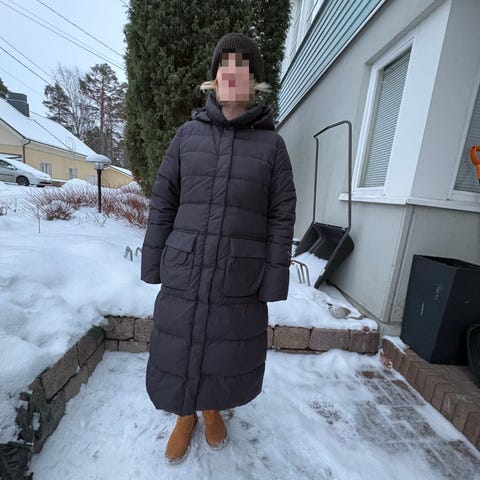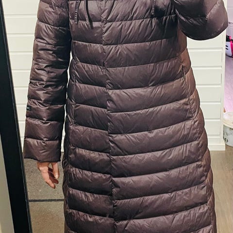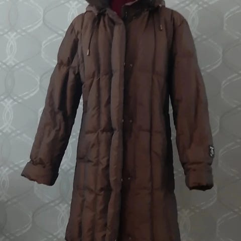 Muutaman kerran käytetty siisti paksu hupullinen untuvatakki. Takin leikkaus on naisellisen kaunis. Takin pituus on 114 cm, rinnan ympärys 112cm, vyötärön ympärys 104 cm. ja helman ympärys 146 cm.