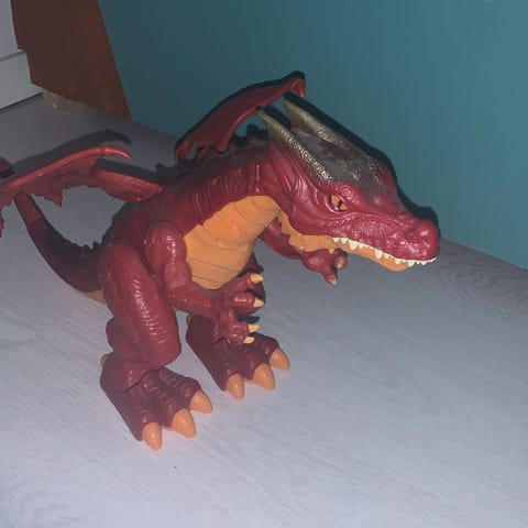 Tytön kasvettua kymppi-ikään vaihtui dinosaurusleikit piirtämiseen ja askarteluun. Myyntiin tämä lempparilelu joka kävelee ja karjuu. Myös siipiä voi liikuttaa ylös- ja alas. Myynnissä myös samanlainen punainen. 30e/kpl tai 50e molemmat.